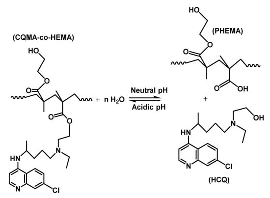As can be observed from these curve profiles, the capacity of the CQMA-co-HEMA system to swell did not vary continuously with the pH medium, regardless of the copolymer composition. Indeed, for the drug carrier systems containing a CQMA content equal or superior to 6.22 wt%, the swelling degree at saturation reached a maximum in pH media 3 and 7, then passed by a minimum when the pH medium was 5, while for the CQMA-co-HEMA system containing less CQMA (4.70 wt%), the variation in the swelling rate at equilibrium reached its maximum at pH medium 3, then continuously decreased to reach a minimum at pH 7. Similar results were also obtained by different authors on the swelling capacity of PHEMA-containing amine groups [39,40]. These authors explain the increase in the swelling degree by the positive charge on the amine after protonation in the acidic medium. According to these authors, the electrostatic repulsion gives more volume to the hydrogel, allowing the diffusion of a higher water content. Similar results were also obtained by Kost et al. [40]. In this case, the greater the amount of CQMA in the copolymer, the greater the swelling capacity. This seemed to be true at a certain limit of CQMA content, but the three copolymers containing equal amounts of CQMA or more than 7.22 wt% practically had the same swelling capacities in pH medium 1. At pH 3, the swelling at equilibrium reached its maximum for all the samples. Similar results were also obtained by Sari et al. [39] in the case of copolymers involving HEMA and N,N-dimethylaminoethyl methacrylate (DMAEMA) monomers. At a high CQMA content (9.68 and 14.82 wt%), the increase in the release dynamic in the neutral pH medium was probably due to the elimination of HCQ from the copolymer through a retroesterification reaction, which was favorable in the medium at pH 7 as shown in Scheme 3. In this case, the hydrophilic contact density between hydroxyl (HEMA) and hydroxyl (water) increased at the expense of the hydrophobic contact density between carboxyl ester and hydroxyl water, resulting in a higher swelling of the system.