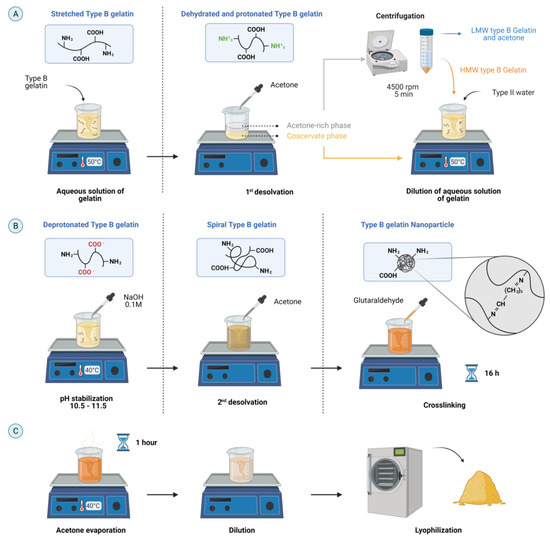 Schematic for the synthesis of type B gelatin NPs (GNPs) by a two-step desolvation method with acetone. (A) Type B gelatin was dissolved, dehydrated, and protonated by a first desolvation step. (B) Then, HMW type B gelatin was deprotonated to then induce a controlled gelatin coiling and crosslinking. (C) GNPs recovery (created with BioRender.com, accessed on 12 October 2021).