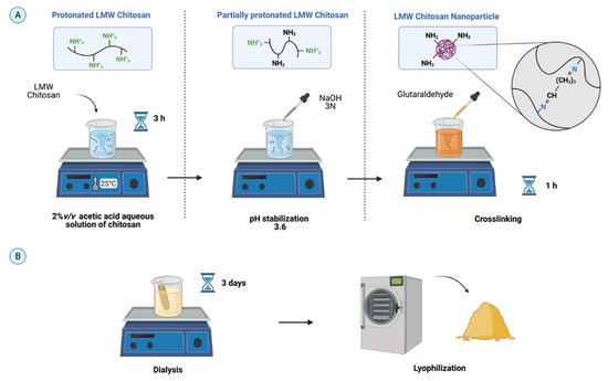 Schematic for synthesizing low molecular weight (LMW) chitosan NPs (CNPs) by the ionic gelation method in aqueous 2% v/v acetic acid. (A). LMW chitosan was protonated to achieve dissolution and deprotonated to control aggregation before chemical crosslinking with GTA to form the NPs. (B). CNP purification and recovery by three-day dialysis and lyophilization (created with BioRender.com, accessed on 12 October 2021).