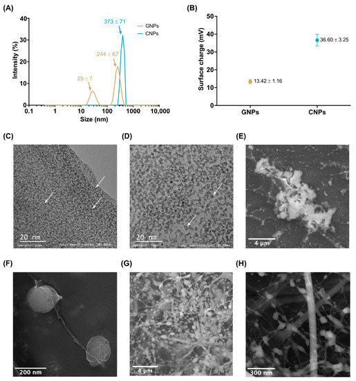 Characterization of GNPs and CNPs. (A) Hydrodynamic average diameter. CNPs were close to 373 nm, and GNPs to 244 nm and 29 nm. (B) Zeta-potential (absolute value) of GNPs (−13 mV) and CNPs (+37 mV). TEM image of GNPs (C) showed a nominal size of 2 nm while CNPs (D) of 5 nm. (E) SEM image of GNPs. White dots confirm NP size below 100 nm and up to 400 nm agglomerates with a spherical shape. (F) SEM image of CNPs. The visualized sample shows 170 nm NPs with an elongated structure. Cryogenic-SEM of an aqueous solution of GNPs (G) and CNPs (H). Round-shaped morphology, nanofibers, and agglomerate formations. Aggregates of NPs and round-shaped morphology were observed together with fiber-like structures interconnected due to absorbed water between NPs. White arrows point to the individual polymeric NPs.
