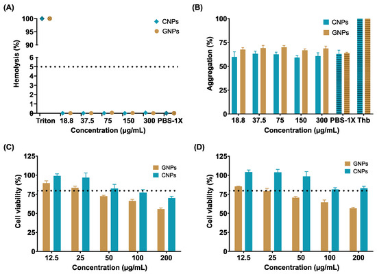 Biocompatibility assessment confirms the relatively low cytotoxicity of NPs since cell viability remained at about 50% (GNPs) and 75% (CNPs) after 24 and 48 h for the maximum tested concentration (200 µg/mL). This could be most likely attributed to their high affinity for cells membranes, causing massive internalization and consequently the triggering of apoptotic routes. This strongly suggests that if used as cell-penetrating agents, only low doses of the NPs might be needed to achieve a sufficiently high therapeutic effect and effective delivery. Additionally, the hemolysis percentage was below 1%, and platelet aggregation was close to the negative reference (PBS 1X), confirming their potential for a safe intravenous administration.