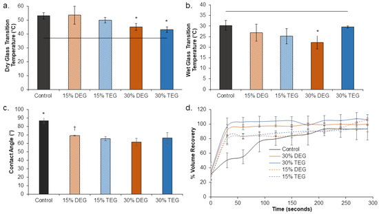 Thermal, shape memory, and hydrophilicity properties of SMP foams. (a) Dry glass transition temperature (n = 3, * p < 0.05 relative to control), (b) wet glass transition temperature (n = 3, * p < 0.05 relative to control), horizontal line is provided as a reference for body temperature (37 °C) in (a,b). (c) contact angle (n = 5, * p < 0.05 relative to all other samples, † p < 0.05 relative to 15% TEG and 30% DEG samples), and (d) volume recovery of samples (n = 3) in deionized water at 37 °C. Mean ± standard deviation displayed in all panels.