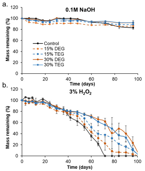 Mass loss profiles of samples as a function of time in (a) accelerated hydrolytic degradation media, 0.1 M NaOH, and (b) oxidative degradation media, 3% H2O2. n = 5, mean ± standard deviation displayed. Legend provided in (a) applies to both charts.