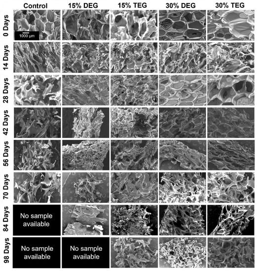 SEM was used to analyze pore morphology every two weeks, as shown in Figure 5. Control foams began losing their porous structure by 14 days and underwent significant strut breaking by 28 days. Total pore collapse was observed in control foams by 42 days. Among the ether-containing foams, 30% DEG and 30% TEG generally maintained their pore morphology while shrinking over time, with some strut breakage at ~70 days and collapse at ~98 days. Material shrinkage can also be seen in 15% DEG and TEG foams, with maintained visible pores over ~70 days. Due to complete sample degradation, no images could be obtained of control foams past 70 days or of 15% DEG foams past 84 days.