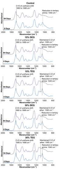 FTIR spectra during degradation in 3% H2O2 revealed a shift in the urethane peak from 1680 cm−1 to 1688 cm−1 and a reduction in tertiary amine peaks of HPED and TEA at 1050 cm−1, which has been previously observed, Figure 6 [7]. As the tertiary amine peak in the ether-containing foams is reduced, the ether peak at ~1090 cm−1 become more apparent, indicating that the ether groups remain stable during degradation. There is no visible evidence of ether crosslinking (branched ether peak at ~1174 cm−1) during degradation in the FTIR spectra [26].