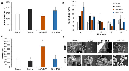 Since 15% DEG and 15% TEG had a faster degradation rate compared to 30% DEG and 30% TEG samples, cell and blood interactions were studied exclusively for the foams containing 30% ether linkages along with control foams and a clinical control (QuickClot gauze). Cell viability was confirmed to be ~100% for all samples after 24 h of incubation, Figure 7a. Images of live/dead cells can be seen in Figure 7b. Live cells are stained green and dead cells are stained red. As seen in Figure 8a control foams absorbed the highest amount of blood among the tested samples, and all materials absorbed between 100 and 200% of their dry weight in blood. In the coagulation study, the amount of free RBCs was higher in SMP foams relative to gauze at 0 min. However, comparable coagulation profiles were observed by 6 min Figure 8b. At 18 min and beyond, 30% DEG had the lowest number of free RBCs amongst all test samples, indicating a higher clotting capability. Images of lysates can be seen in Supplementary Materials Figure S2. Platelet attachment was quantified after incubation of samples in platelet-rich plasma. As shown in Figure 8c, maximum platelet attachment was observed on 30% DEG, followed by gauze and 30% TEG with comparable platelet numbers that were approximately half that of 30% DEG. Control foams had the lowest number of attached platelets. These results correlate the platelet aggregation and activation visualized using SEM micrographs, Figure 8d. The gauze clinical control had aggregated platelets with evidence of thrombus formation. All three SMP foams showed evidence of platelet activation (small protrusions on platelet surfaces) and aggregation, and imaged platelet densities correspond with the numbers quantified using the LDH assay.