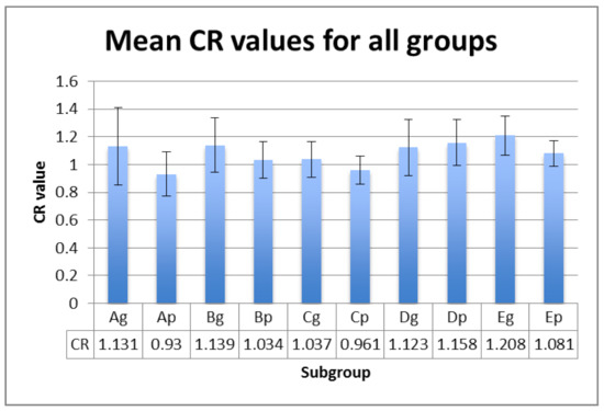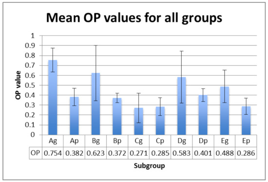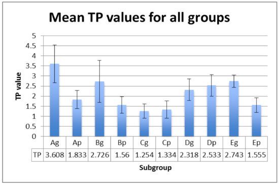 L*, a*, b* values were registered on white and black backgrounds, and the calculated TP, CR and OP values are displayed in Figure 1, Figure 2 and Figure 3 for each subgroup.