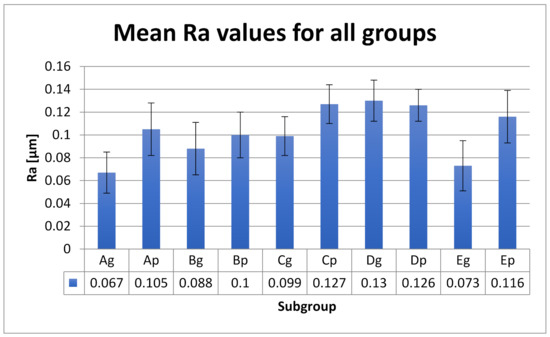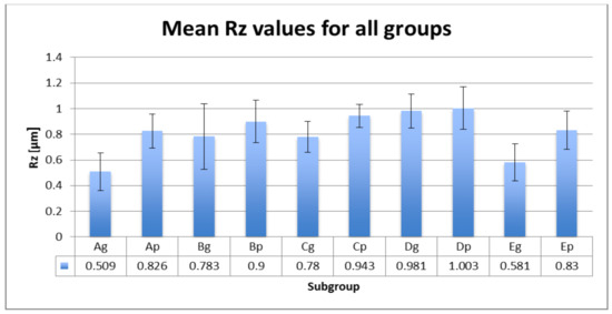 Specimens’ surface roughness was analyzed with a contact 2 µm stylus profilometer, Surftest SJ-201 (Mitutoyo, Kawasaki, Japan), for each subgroup. Arithmetic average roughness (Ra) and maximum absolute vertical roughness (Rz) measurements were performed in 5 different directions and all data were recorded. The mean value of the 5 measurements was calculated for each surface. The sampling length was 0.8 mm, and a force of 0.7 mN was applied.