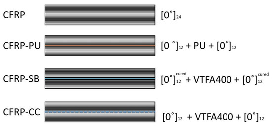 Toughening a composite material is a common tactic for enhancing damage resistance. There has been much interest in inserting thermoplastic veils to improve interlaminar fracture toughness [10,11,12,13], especially since the commercialization of Xantulayr®, a toughening veil made of electrospun nanofibres by Revolution Fibers [14]. Depending on the type of fibres, soluble or insoluble, thermoplastic veils can result in agglomerates when the dispersion is poor. A soluble veil can be a nanoparticle carrier and result in agglomerates that weaken the composite structure, unlike an insoluble veil [15]. Several studies have developed custom interleaves that significantly increase CFRP interlaminar fracture toughness [16,17,18,19,20]. Arai et al. [21] embedded nanomodified films in CFRP and reported about 200% higher mode I fracture toughness than for a pure CFRP laminate. Others have also reported higher mode I and mode II interlaminar fracture toughness by using interleaves of different polymeric structures [22,23,24,25,26,27]. The development of custom interleaves with intricate heterogeneous structure (veils or sophisticated nanoparticle systems) using higher cost precision fabrication techniques is gaining attention, however, the object of the present study is to investigate whether the same toughening effects can be achieved with existing homogeneous, less expensive off-the-shelf commercial single ply films. Polyurethane (PU) is a polymer that is commonly used as a foam or matrix. Only a few studies found in the literature use PU films or nets for energy absorption properties [28,29,30,31,32]. Kishi et al. [31] used several types of films, including polyurethane, in multiple locations in a laminate to enhance the damping loss factor. The latter increased by a factor of two at multiple frequencies where PU films were used, but at the expense of lower flexural properties compared to the control CFRP, i.e., a decrease in modulus from 120 GPa for the neat CFRP control to 21 GPa for the PU-laminate. In a later study, Rizzo et al. [32] used polyurethane films as coatings on the top of CFRP laminates to improve their impact resistance, resulting in lower internal damage for railway applications. Although polyurethane films have been used with laminates previously (as alternating interleaves or surface films), there is, to the best of our knowledge, no published description of a laminate with a single embedded PU film, which introduced in this paper.