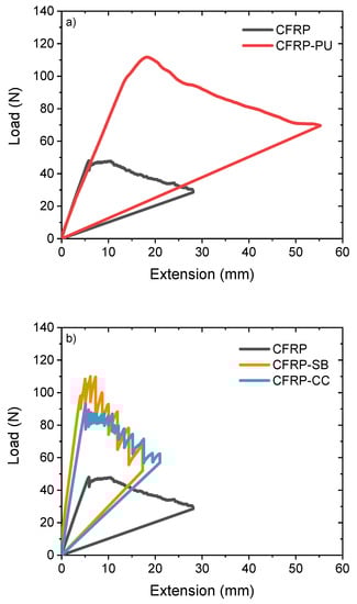 The R-curves for the DCB tests were obtained from the experimental force-displacement, P-δ, curves, considering the data reduction method proposed in the test standard. The introduction of the films has significantly increased the values of mode I interlaminar fracture toughness. From the results obtained, an increase in mode I fracture toughness of ca. 290% was observed for the CFRP-PU specimens compared with the reference CFRP specimens; however, there was no significant increase in the mode I toughness for the CFRP-CC and CFRP-SB. From the representative P-δ curve, Figure 2a, the CFRP exhibited a typical brittle behaviour with a sudden drop in the critical load point of interlaminar fracture and subsequent smaller load drops. In contrast, the CFRP-PU showed a continuous crack growth with a smoother load slip, giving an indication of plastic deformation at the interface and generally more ductile behaviour. The CFRP-SB and the CFRP-CC specimens followed similar crack propagation behaviour, with more abrupt load drops indicative of more brittle behaviour. The load drops tended to behave in a more stick-slip manner with an immediate arresting of the crack, Figure 2b. This could be also attributed to the existence of the polyester net in the adhesive film, which could act as a local alternating energy store–release structure.