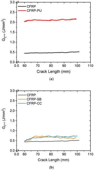 Representative mode I interlaminar fracture toughness in the crack propagation area for the CFRP compared with the (a) CFRP-PU; and (b) CFRP-SB and CFRP-CC.