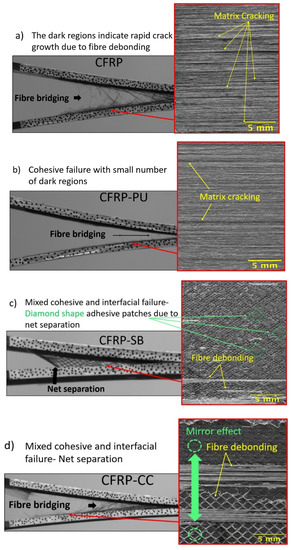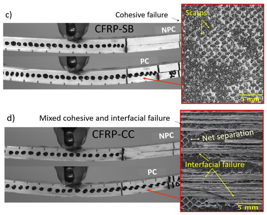 The CFRP-SB and CFRP-CC specimens, Figure 4c,d, behaved in a contrasting fashion. Fibre bridging behaviour was observed with high crack step propagations in both types of specimens, which led to partial loss of detection of the crack propagation in some of the tested CFRP-CC samples. When using the extensometer, it was observed that the sudden crack propagation could sometimes be difficult to detect, especially in brittle fractures. From the P-δ curves shown in Figure 2b, specimens produced by both the manufacturing processes indicated similar behaviour with sudden load slips. For the CFRP-SB, load slips were observed in almost all tested specimens. In Figure 4d, interfacial failure was detected, and in various areas of the CFRP-CC specimens, cohesive failure was also recorded. Due to separation of the polyester net, a mirror effect was observed. CFRP-SB specimens behaved similarly, with less fibre bridging and more areas of cohesive failure, especially as shown in Figure 4c, where one can see diamond-shaped cohesive areas due to polyester net separation during the test.