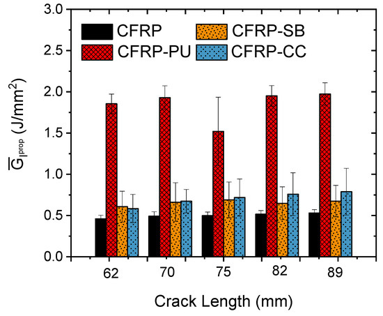 Average mode I interlaminar fracture toughness at different crack lengths for all the cases.