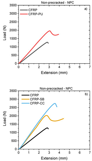The CFRP-PU, CFRP-SB and CFRP-CC laminates showed higher mode II values than those of neat CFRP laminates, Table 2. More precisely, CFRP-PU had higher mode II toughness than the CFRP, but lower toughness compared to CFRP-CC and only statistically equivalent toughness to CFRP-SB. In both data sets NPC and PC, Figure 6b,d, respectively, CFRP-SB specimens had lower mode II toughness compared with the CFRP-CC, which had the highest mode II toughness than the CFRP. The CFRP-CC showed extremely good resistance to mode II fracture compared to the CFRP-SB, which indicated that the interlocking mechanisms that developed between the two epoxies because of the co-curing process, could be a significant factor in failure due to shear.