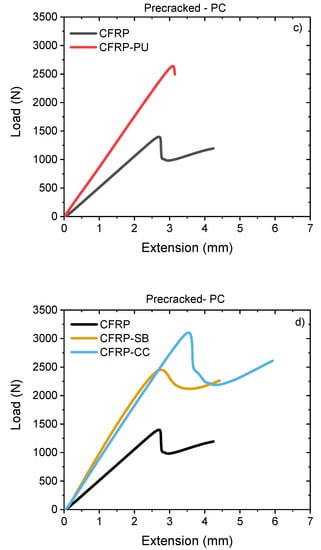 NPC R-curves curves (top) and PC R-curves (below) for (a) CFRP compared with CFRP-PU, NPC curve, (b) CFRP compared with CFRP-SB and CFRP-CC, NPC curve, (c) CFRP compared with CFRP-PU, PC curve and (d) CFRP compared with CFRP-SB and CFRP-CC, PC curve.
