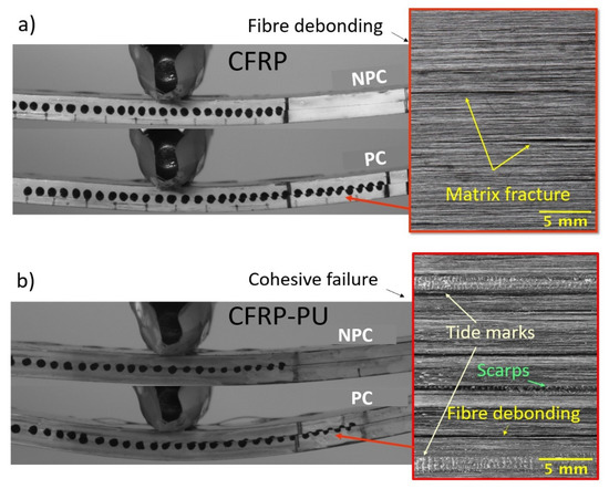 Visually, mode I fracture surfaces were rough in texture because of fibre bridging, while mode II fracture surfaces were smoother, since under shear loading, the fibres fractured either in compression or tension depending on the relative movement of the surface. Figure 7 represents the NPC and PC side view captures shots from the recordings of the video gauge extensometer, and images of the fractured surfaces taken with a Nikon D3500 camera. In general, plastic deformation and higher deflection were observed for CFRP-PU and CFRP-CC, Figure 7b,d, unlike the other two cases, CFRP, Figure 7a, and CFRP-SB, Figure 7c, where their deflection was significantly less. Matrix cracking, dark areas and loose fibres were detected for the CFRP specimens as observed in Figure 7a.