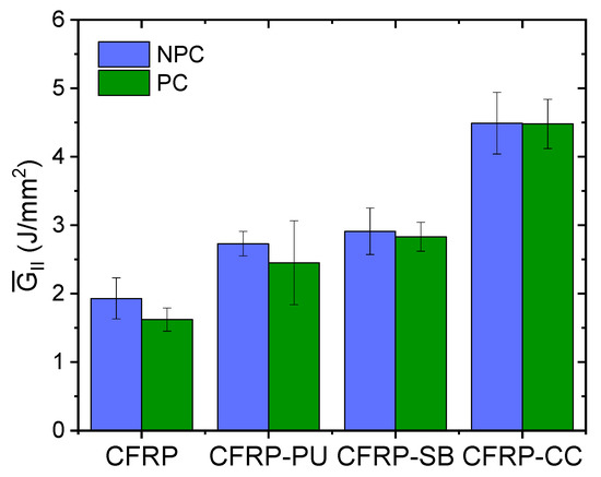 Average mode II interlaminar fracture toughness for all the cases, NPC and PC.