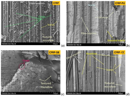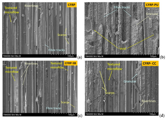 Figure 9a shows the surfaces of failed CFRP mode I, DCB, specimens. Fibre tracks, textured microflow and scraps dominated the surface indicating typical brittle behaviour. Fibre debonding and matrix cleavage were the two dominant fractographic features in this case. Typically, the fractures grew along the fibres, then spread into the matrix as a textured microflow, and then converged with each other. Finally, due to the crack propagation, ribbons and riverlines were detected in CFRP fractured surfaces. In contrast, the microstructure of CFRP-PU exhibited a rougher fracture surface, Figure 9b. The fractographic behaviour of this material tended to be dimpled or granular because of the tough nature of the thermoplastic film. As a result, the fracture surface was characterised by a tortuous crack path with visible fibre tracks, which also provided evidence that the adhesion between the polyurethane, the epoxy resin and the carbon fibres was very good. Scarps, riverlines and textured microflow were observed in both the CFRP-SB and the CFRP-CC specimens, Figure 9c,d, respectively. Although textured microflow was less evident in the latter, the brittle characteristic fractographic behaviour was still observed, especially in the fibre track areas. Lastly, in areas of the CFRP-CC specimens, granular surfaces were observed, indicating that the adhesive had a toughening character.