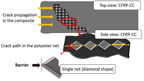 In Figure 11, an illustration of the CFRP-CC behaviour in mode II is presented. The crack propagation due to shear loading meets a ‘barrier’ at the polyester net. A local energy ‘hold and release’ mechanism takes place, (see stick-slip behaviour in Figure 2b) due to the structure of the net in the loading direction. Similar behaviour was observed by Parvatareddy et al. [62], where the scrim cloth of the adhesive used played an important role in energy dissipation by providing weakened sites.