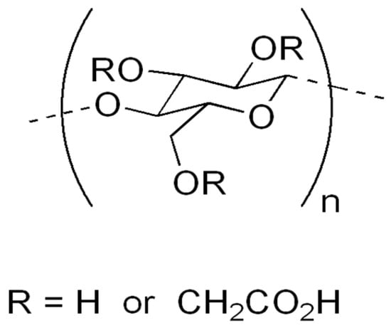 Carboxymethyl cellulose (CMC) (Figure 2) is probably the best-known cellulose derivative, which is water-soluble cellulose ether, obtained by reacting sodium monochloroacetate with cellulose in an alkaline medium [9]. This cellulose derivative is an anionic, linear, highly viscous polysaccharide, confirmed as a nontoxic, non-allergenic and biodegradable substance [57,58]. Because all reactions for synthesis are operated at atmospheric pressure, by using commercially available reagents, the production of CMC is simpler than that of most other cellulose ethers [59]. It has a huge range of different applications in different products and processes, such as oil drilling [60], detergents, food exploration, paper, textiles, pharmaceuticals [61] and the agricultural industry [13]. Recently, CMC has found new interest in advanced fields such as tissue engineering [62], dye and lithium ion batteries [63] and the adsorption of heavy metals [64,65,66].