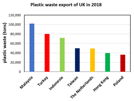 For the past three decades, many countries including US, Japan, EU, Mexico etc. have exported their plastic waste to China and surrounding countries, which partially prevented the plastic debris going to solid waste disposal areas or incineration at those countries. However, in the last decade, China initiated restrictions on plastic waste importing policies, and finally banned the import of nonindustrial plastic waste in January 2018 [2,4]. Immediately afterwards, other Southeast Asian countries such as Malaysia rose noticeably as global plastic waste importers, but this was temporary, because such countries adopted restrictions on plastic waste importing policies as well. According to Zhao et al. [5], the center of gravity on global plastic waste trade is still evolving. For instance, the EU transformed from being a significant plastic waste exporter to being both a significant importer and exporter. Meanwhile, Turkey has become one of the growing plastic waste importers taking attention for the last few years. It suddenly entered the top 10 global plastic waste importers list in 2017, which was 10th in the list in 2017 with 26.19 × 104 tons imported plastic waste and became 7th in 2018 with 43.69 × 104 tons imported plastic waste [5]. In the same year (2018), Turkey became the second largest global importer of British plastic waste with 8 × 104 tons [6] as shown in Figure 1, which increased to 21 × 104 tons in 2021 [7]. However, it was dramatic to see that some of those imported plastic wastes were illegally dumped on fields and some burned, instead of being properly recycled [8]. In 2021, Turkey has initiated restrictions on plastic waste importing policies. Note that those reported random dump sites are not even Municipal Solid Waste (MSW) facilities, the engineering design of which would also be assessed considering microplastic contamination later in this paper.