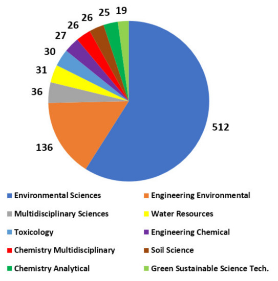 Hence, microplastic contamination is already an increasingly ubiquitous problem which requires the cooperation of different disciplines (fields). However, it seems that there is a delay of global awareness between different disciplines regarding the microplastic contamination in different environments. For instance, Figure 2 gives the top 10 disciplines and the distribution of published studies on microplastics and soils in the Web of Science Core Collection database between January 2016 and October 2021 (some studies for 2022 were also available in the database but not included in Figure 2). Accordingly, the top 10 disciplines working on microplastics and soils for the past 6 years are Environmental Sciences, Environmental Engineering, Multidisciplinary Sciences, Water Resources, Toxicology, Chemical Engineering, Chemistry, Soil Science, and Green Sustainable Science Technology. Moreover, Figure 2 shows that there are only two Engineering disciplines (i.e., Chemical and Environmental) which show sufficient awareness (conducts considerable research) about microplastics and soils.