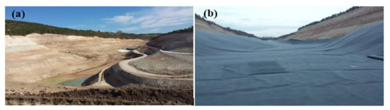 A geosynthetic clay liner (GCL) is a lining and barrier material that consists of a thin bentonite layer sandwiched between two geotextiles [72]. In recent years, the design engineers have preferred to use geosynthetic clay liners (GCLs) as an alternative to the CCLs as the barrier material in the waste disposal facilities [76]. Moreover, the GCLs have some advantages over the CCLs such as having lower hydraulic conductivity (<10−10 m/s), lower thickness (4–10 mm), lower cost, less labor work and faster installation [72,77,78]. The most critical component of a GCL that determines the hydraulic performance of the barrier material is the bentonite layer [79,80,81]. A waste disposal area in Kütahya, Turkey before and after the placement of a barrier system that was composed of a geomembrane-laminated GCL is shown in Figure 4.