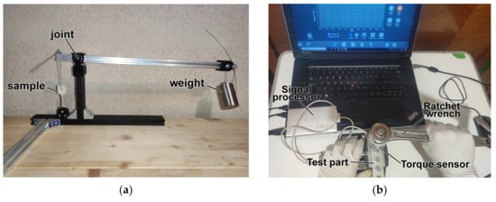 For destructive compression strength tests, 10 cubic samples of 15 × 15 × 15 mm in size were printed from each of the 2 materials and tested on an Instron 8801 machine (Instron, Norwood, MA, USA). Parts were loaded with a speed of 1 mm/min along the Z-axis starting with a preload force of 5 N. Results of compressive strength testing are shown in Section 3.3. Images of the two mechanical testing setups described above are available in Supplementary Information (Figures S1 and S2). Following tensile and compressive testing, the creep characteristics of the materials were also assessed. Creep is the property of certain materials to deform plastically over time under loads significantly lower than the loads allowed by ultimate strength. Ten samples were 3D-printed from each of the two materials according to dimensions found in ASTM D2990-17 [52]. A testing rig was designed to load parts in tension (Figure 2a). Samples were loaded with approximately 25% of the load found at ultimate strength for the control group for each material. The distance between the sample ends were measured using a micrometer after 2 h, 6 h, 12 h and 24 h, followed by measurements every 24 h for a total load time of 1 week. Sample elongation was calculated based on the average between the two measurements and elongation vs. time charts were drawn. Additionally, two samples from each material were printed to assess compressive creep. Each sample had 5 bores 6 mm in diameter where a M6 nut and bolt assembly was mounted. The nut and bolt assembly was tightened using a torque wrench (Figure 2b) and the input torque was measured using a MR-55 1000 torque sensor made by Mark-10 Corporation (Copiague, New York, NY, USA). The clamping force was delivered to the 3D-printed material through two washers on each side of the material, with an external diameter of 12 mm and an internal diameter of 7.5 mm. Images of samples 3D printed for creep tests are available in Supplementary Information (Figures S3–S5).