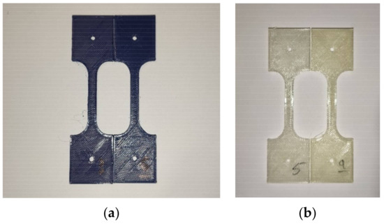 Fracture modes of tested parts: (a) PLA parts from the control group; (b) PETG parts from the UV-B exposure group.
