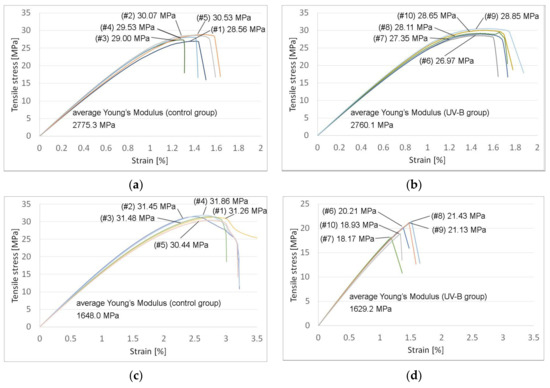 Tensile strength testing results, with Young’s Modulus and tensile stress at tensile strength: (a) PLA control group; (b) PLA with UV-B exposure; (c) PETG control group; (d) PETG with UV-B exposure.