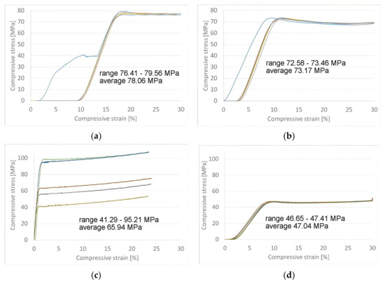 Samples made from PLA and PETG failed plastically under compression load without any cross-sectional shear visible in the outer perimeter of the parts. For PLA, irradiated parts were weaker, losing 6.3% (73.17 MPa vs. 78.06 MPa) of the compressive strength for the control group. The same effect was observed for PETG parts, where the compressive strength for the UV-B-treated group was 38.6% lower than in the control group (47.04 MPa vs. 65.94 MPa). Figure 6a–d show the stress–strain diagrams obtained following compressive testing.