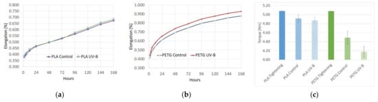 Figure 7a shows a graph of the elongation of the PLA parts under load over the 7-day (168 h) testing period, while Figure 7b shows the same graph for PETG. For both materials, most of the deformation occurred in the initial moments after stressing the test parts and the creep rate decreased as the strain level was increased. As can be seen in the graphs, the parts exposed to UV-B deformed more under the load but displayed a similar creep curve pattern. The heavier deformation is thus considered to occur due to the weakening of the parts. In terms of compression creep behavior, all investigated samples untightened at a torque lower than the standard tightening torque of 5.07 N·m after 7 days. For the control group PLA samples, the clamping force was reduced by 3.3% to 4.92 ± 0.04 N·m, while the control PETG samples saw a bigger reduction, with the untightening torque being reduced by 11.5% to 4.49 ± 0.07 N·m. In the PLA samples that were subjected to UV-B radiation, the untightening torque was virtually unchanged compared to the control group, with the screws requiring on average 4.87 ± 0.04 N·m of torque to untighten. The PETG samples in the UV-B group, however, saw a 7.5% further decrease in torque compared to the control group, with the average required torque being 4.18 ± 0.06 N·m. A bar chart of the experimental results for the untightening torque measurements is shown in Figure 7c.