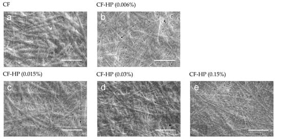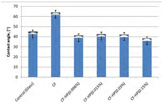Contact angles of the collagen fibrils after different HP treatment: CF—collagen fibrils before treatment; CF-HP (0.006%)—collagen fibrils after HP treatment with concentration 0.006%; CF-HP (0.015%)—collagen fibrils after HP treatment with concentration 0.015%; CF-HP (0.03%)—collagen fibrils after HP treatment with concentration 0.03%; CF-HP (0.15%)—collagen fibrils after HP treatment with concentration 0.15%.