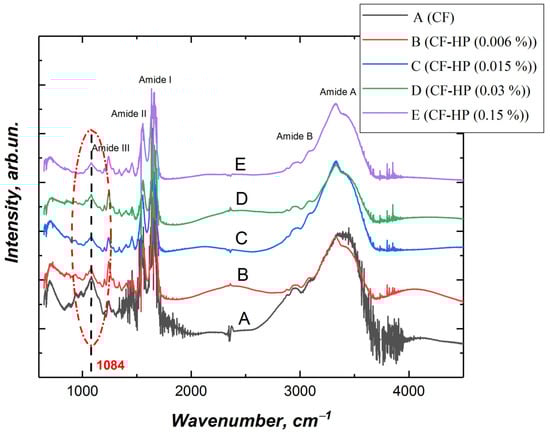 FTIR spectra of collagen fibrils after different HP treatment: CF—collagen fibrils before treatment; CF-HP (0.006%)—collagen fibrils after HP treatment with concentration 0.006%; CF-HP (0.015%)—collagen fibrils after HP treatment with concentration 0.015%; CF-HP (0.03%)—collagen fibrils after HP treatment with concentration 0.03%; CF-HP (0.15%)—collagen fibrils after HP treatment with concentration 0.15%.