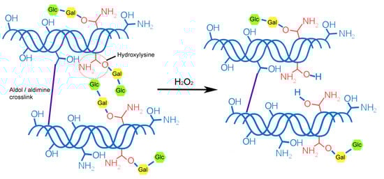 Schematic diagram of collagen fibril structure modification after hydroxide peroxide treatment. (Gal—galactose, Glc—glucose).