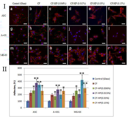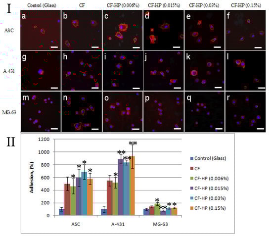 (I) Fluorescence micrographs of cells with actins (red) and nuclei (blue) stained after 1 h cultivation: (a) ASCs on the pure glass, (b) ASCs on the pristine CF, (c) ASCs on CF after HP treatment with concentration 0.006%, (d) ASCs on CF after HP treatment with concentration 0.015%, (e) ASCs on CF after HP treatment with concentration 0.03%, (f) ASCs on CF after HP treatment with concentration 0.15%, (g) A-431 on the pure glass, (h) A-431 on the pristine CF, (i) A-431 on CF after HP treatment with concentration 0.006%, (j) A-431 on CF after HP treatment with concentration 0.015%, (k) A-431 on CF after HP treatment with concentration 0.03%, (l) A-431 on CF after HP treatment with concentration 0.15%, (m) MG-63 on the pure glass, (n) MG-63 on the pristine CF, (o) MG-63 on CF after HP treatment with concentration 0.006%, (p) MG-63 on CF after HP treatment with concentration 0.015%, (q) MG-63 on CF after HP treatment with concentration 0.03%, (r) MG-63 on CF after HP treatment with concentration 0.15%. (II) Statistics of cell adhesion on surfaces with different functional groups after 1 h cultivation. (n = 5: *—p < 0.01, **—p < 0.05 compared with the unmodified CF.) Staining—rhodamine-phalloidin (red), 40,6-diamidino-2-phenylindole (DAPI) (blue). Scale bar 50 µm.
