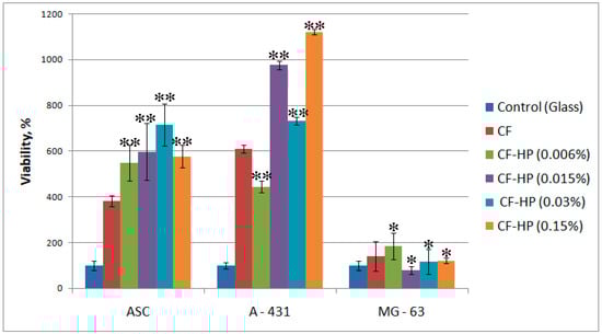Citotoxity study (MTT-test) with ASCs, A-431 and MG-63 cells on collagen fibrils after different HP treatment: CF—collagen fibrils before treatment; CF-HP (0.006%)—collagen fibrils after HP treatment with concentration 0.006%; CF-HP (0.015%)—collagen fibrils after HP treatment with concentration 0.015%; CF-HP (0.03%)—collagen fibrils after HP treatment with concentration 0.03%; CF-HP (0.15%)—collagen fibrils after HP treatment with concentration 0.15%. (n = 5: *—p < 0.01, **—p < 0.05 compared with the unmodified CF).