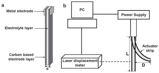 IPMC actuator: (a) Schematic of the structure; (b) schematic of the measurement. Reproduced from [3] with permission from John Wiley and Sons. Copyright 2013.