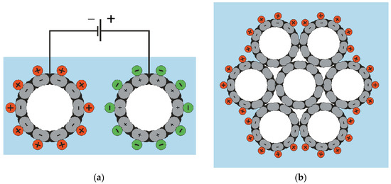 Electrostatic diagram of how one of the nanotube electrodes elongates and the other electrode constricts: (a) both electrodes are represented as individual nanotubes; (b) the electrode is represented as a bundle of nanotubes. Reproduced from [13] with permission from the American Association for the Advancement of Science. Copyright 1999.