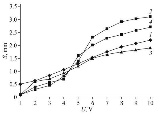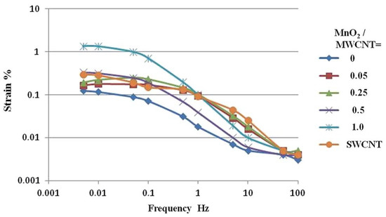 Actuator stretching, recalculated from the peak-to-peak displacement of the actuator with the gel electrode of “polymer/CNT/EMIM[CF3SO3]” and different concentrations of MnO2 in relation to CNTs (sets of points MnO2/MWCNT = 0, MnO2/MWCNT = 1 are selected). Reproduced from [26] with permission from the Royal Society of Chemistry. Copyright 2016.
