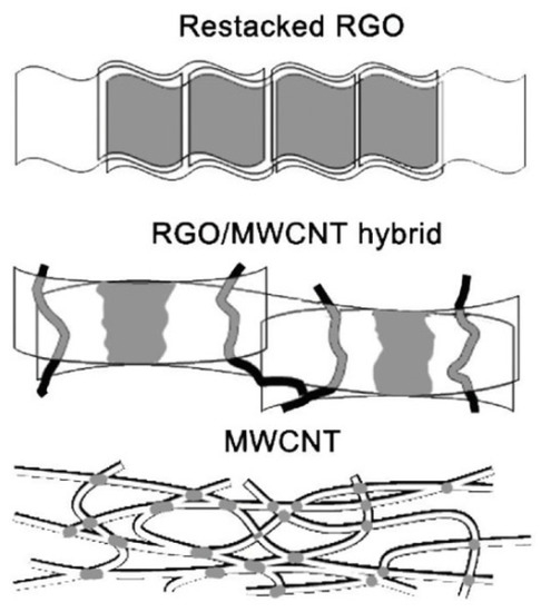 The RGO/MWCNT hybrid was synthesized via additional reduction of the GO/MWCNT structure in hydrazine, under which the tubes short-circuit the graphene sheets (Figure 4).