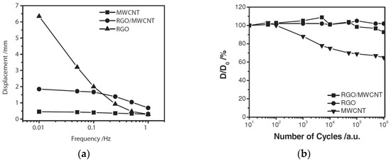 Characteristics of the actuators with electrodes based on MWCNTs, graphene (RGO), and their composite (MWCNT/RGO): (a) frequency dependencies of the displacement amplitude; (b) operational stability depending on the number of cycles. Reproduced from [30] with permission from John Wiley and Sons. Copyright 2012.