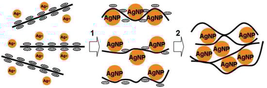 Schematic diagram of how the AgNPs are formed in the space between the graphene flakes during the reduction. Reproduced from [31] with permission from John Wiley and Sons. Copyright 2012.