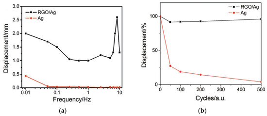 As it is seen from Figure 7a, with electrical stimulation by a 1-V meander signal with a frequency of 0.01–10 Hz, the introduction of RGO increases the actuator displacement in comparison with purely silver electrodes. The operating time gain is even more obvious (Figure 7b).