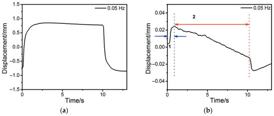 The second important effect is that the actuator with combined electrodes successfully “holds” the meander shelf at maximum amplitude (Figure 8a), in contrast to the actuator with silver electrodes, in which the displacement almost immediately decreases (straightening back, Figure 8b). The reasons for this “non-retention” of the initial displacement of the actuator during the half-period of the meander are clear. When the third charged component (Ag+) appears in the electrolyte and adds to the IL components (BMIM+ и BF4−), the rapid displacement is determined by the Ag+ and BF4− ions that form the primary excessive concentrations of the Ag+ cations at the cathode and the BF4− anions at the anode.