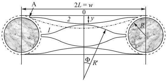The diagram of how a bucky-gel electrode actuator responses to a meander voltage applied across the electrodes is shown in Figure 1. The unperturbed actuator membrane length from the attachment line L, the displacement amplitude D, the curvature radius R, and the outer side stretching (or the inner side compression) ΔL with the membrane thickness d and at small D/L ratio are determined by the almost obvious formulas:
