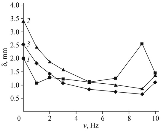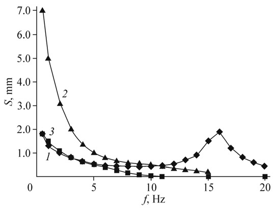 The frequency dependence of the actuator displacement amplitude D is given in Figure 5a. Figure 5b illustrates the decrease in D as compared with the initial amplitude D0 in the course of operation.