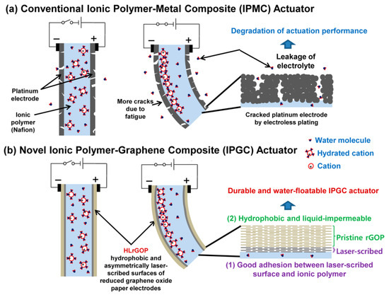 - Kim, J.; Jeon, J.-H.; Kim, H.-J.; Lim, H.; Oh, I.-K. Durable and Water-Floatable Ionic Polymer Actuator with Hydrophobic and Asymmetrically Laser-Scribed Reduced Graphene Oxide Paper Electrodes. ACS Nano 2014, 8, 2986–2997. [Google Scholar] [CrossRef]