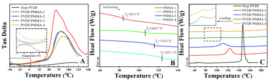 DMA (A) and DSC curves (B,C) of neat PMMA, neat PVDF, and PVDF/PMMA blends with different Mw of PMMA.