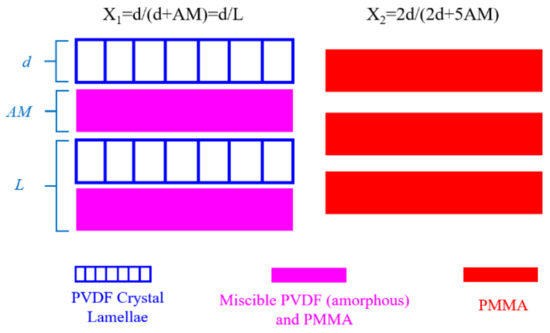 where and are melting enthalpy and standard melting enthalpy, respectively. The of PVDF is 104.7 J/g. It is necessary to convert the mass crystallinity (Xw, from DSC) into volume crystallinity (X2). The relationship between them in the blends of PVDF and PMMA is as follows: